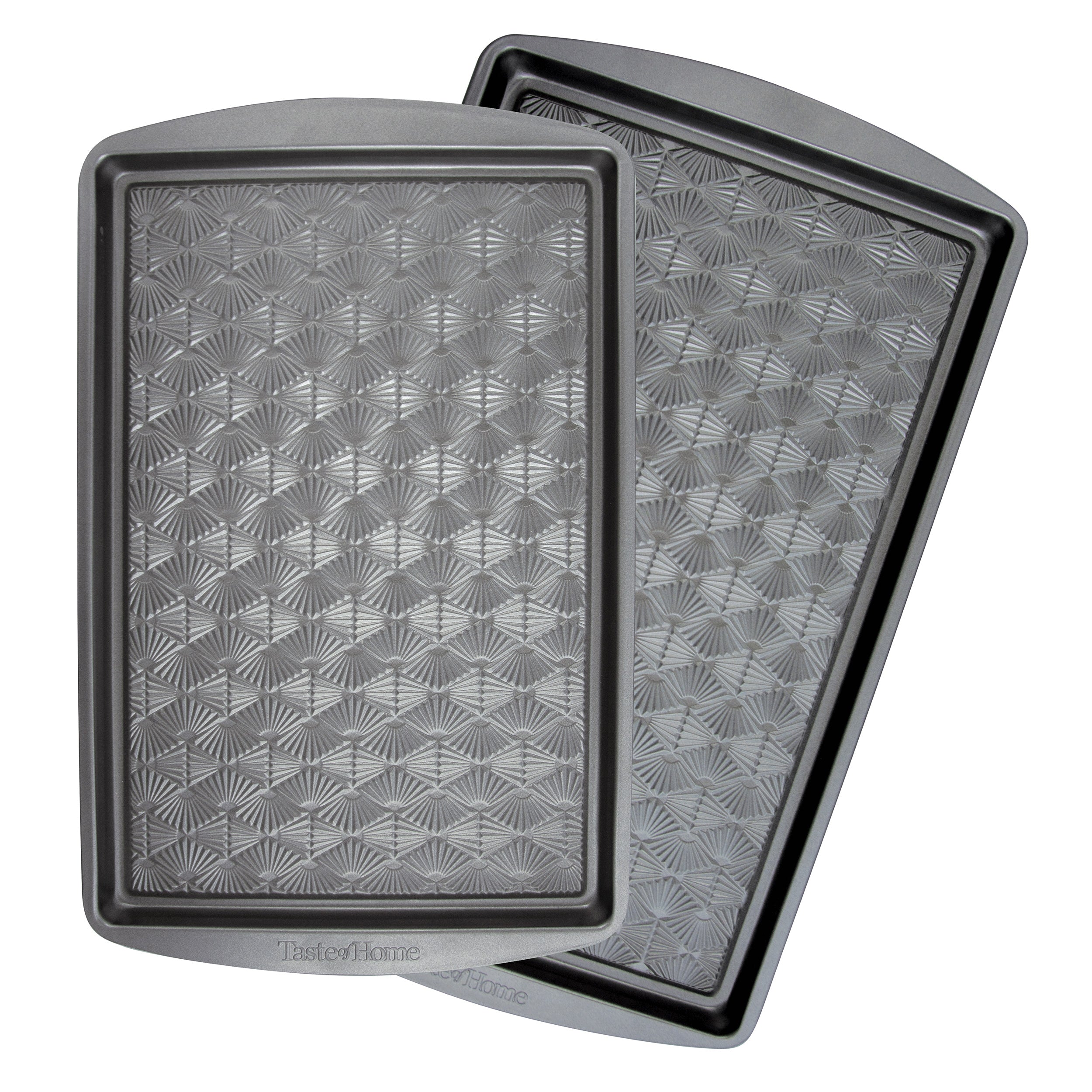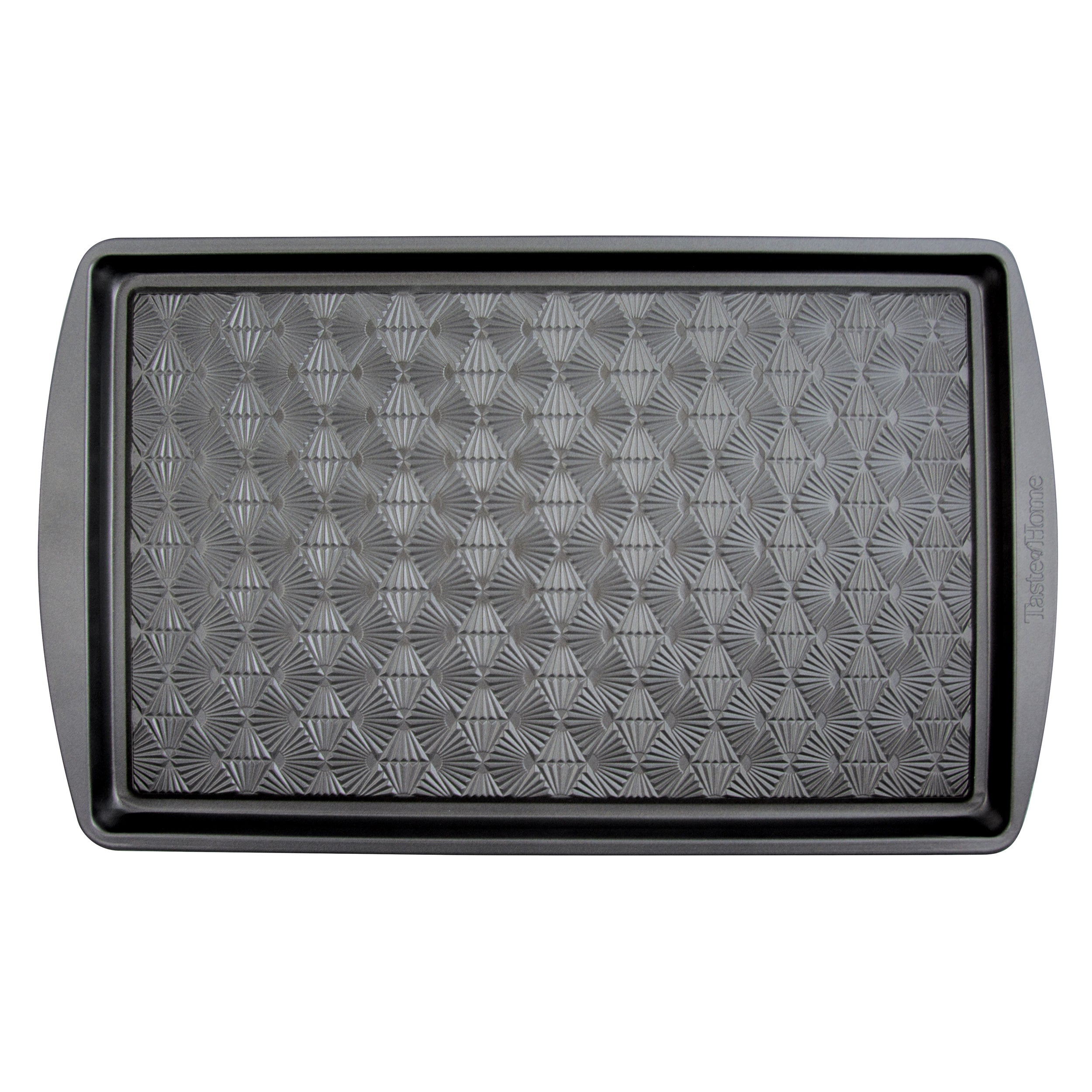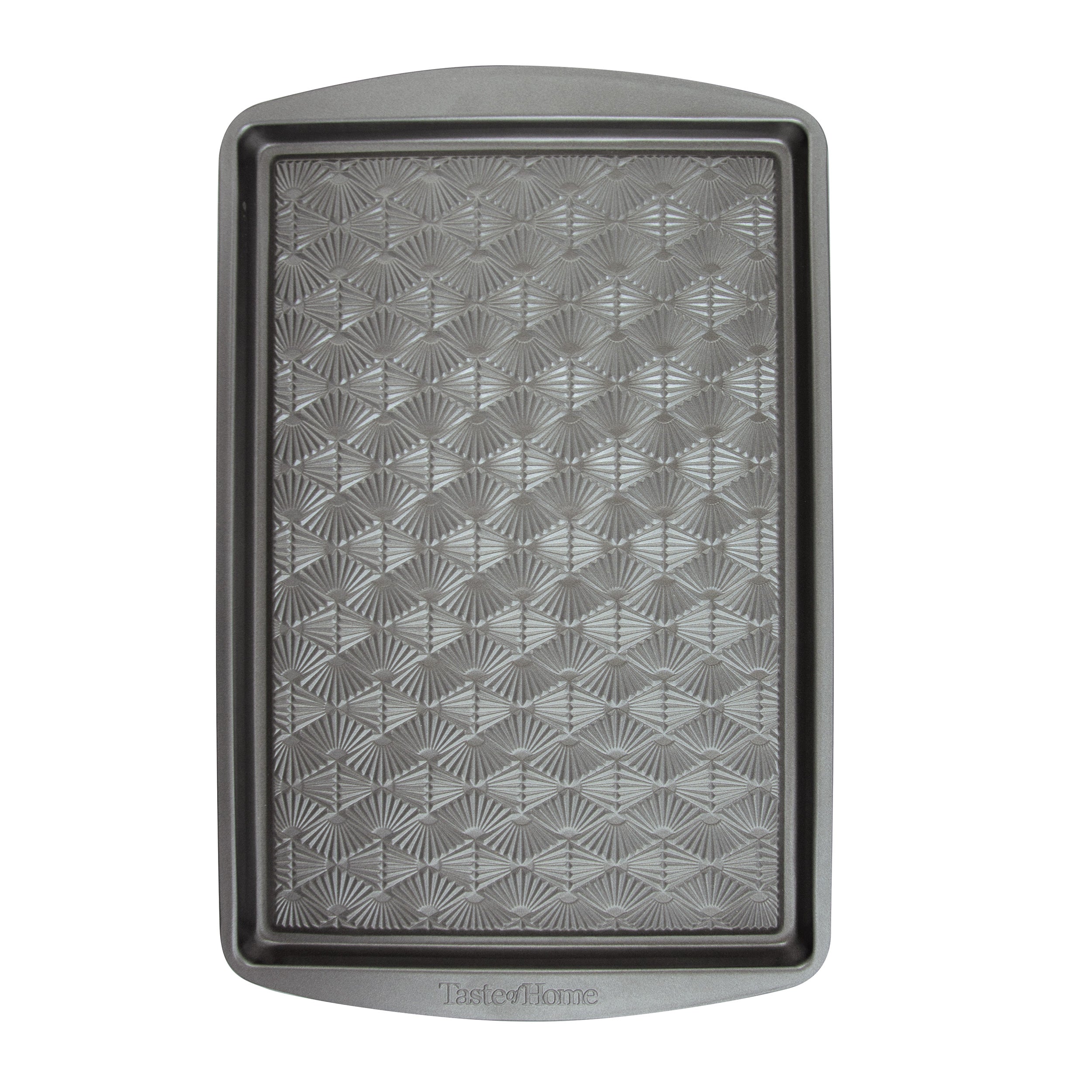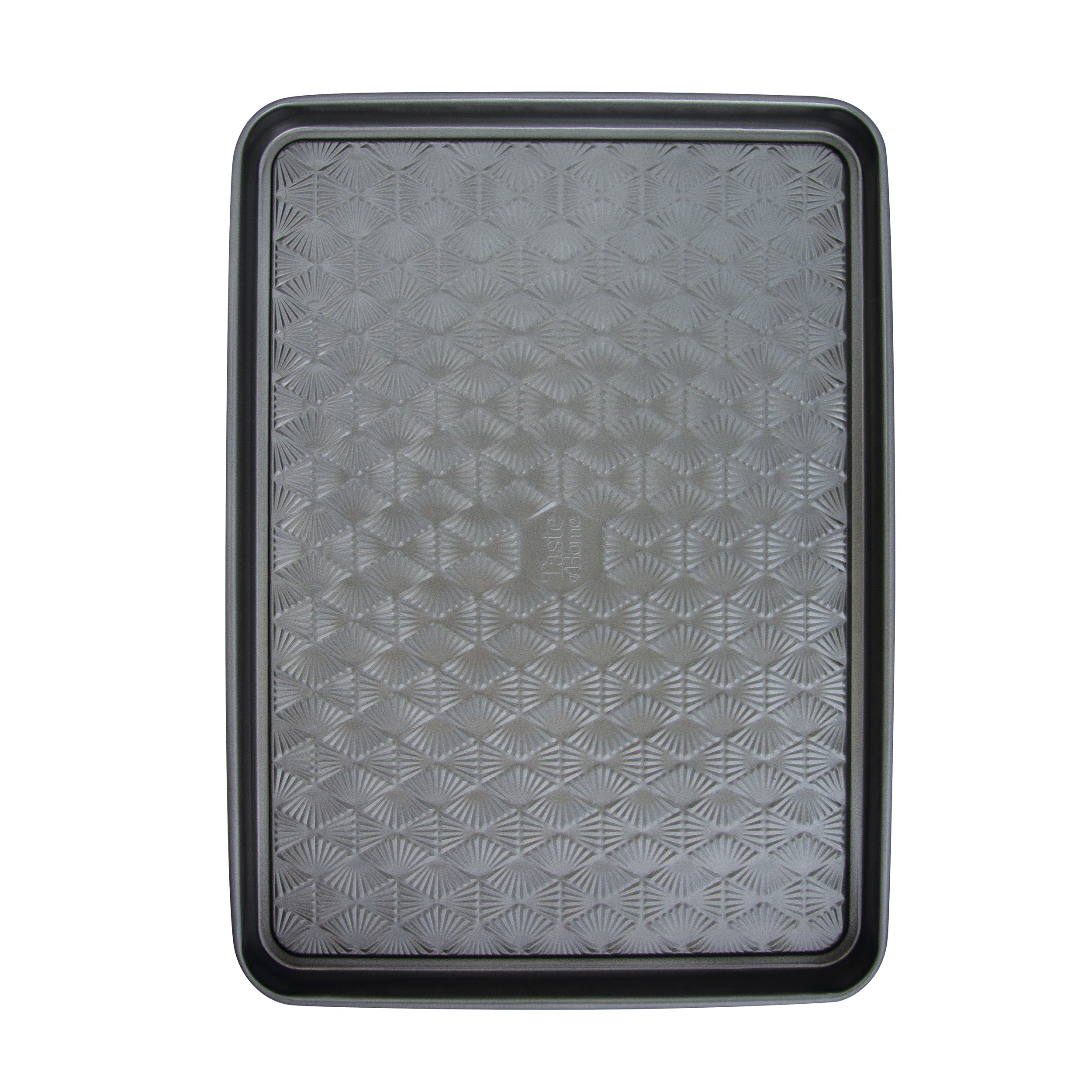 Bake your family favorites in the Taste of Home® Non-Stick Metal Baking Sheet. This durable bakeware is designed for everyday use and is an ideal choice for the home chef. You'll enjoy baking a variety of foods on this baking sheet from tasty desserts to savory sheet pan dinners. Our bakeware features an embossed geometric design that strengthens the baking sheet while increasing the air-flow to food, creating evenly distributed heat for consistent baking every time. This beautiful geometric pattern is carried throughout most of the Taste of Home® product lines, adding style and function to the tools in your kitchen. The Ash Gray color of the bakeware is complementary to modern kitchens. The premium non-stick coating allows for effortless release of foods and will enable you to prepare healthier treats with minimal to no prep to bakeware before baking process, leaving you to feel good about the food you're serving. The easy-to-grip handles make this baking sheet easy to transfer in and out of the oven. When it's time to clean up, simply place your bakeware in the dishwasher for easy cleaning. Bake a variety of foods from scrumptious desserts to savory sheet pan dinners on your Taste of Home® Baking Sheet. All Taste of Home® products are designed in partnership with and rigorously tested by the Taste of Home test kitchen and are Test Kitchen-approved.