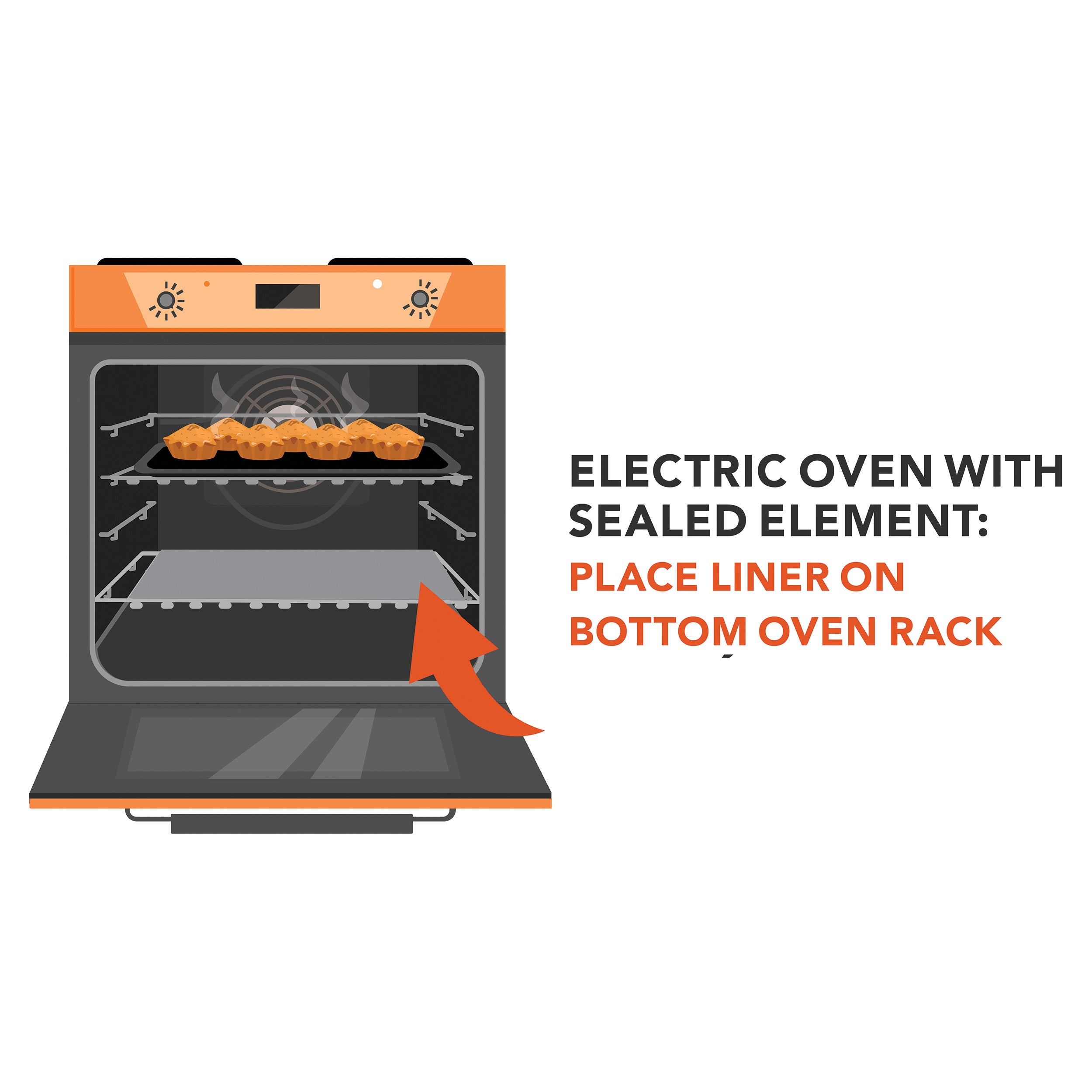 Using your oven means inevitable messes will occur; crumbs will collect, pie filling may spill over while baking, and so forth. Range Kleen's Nonstick Oven Liner is the perfect solution for oven messes. Place the flexible non-stick liner at the bottom of your oven or on the lowest oven rack (see specific installation instructions for more details) to catch spills, crumbs, and everything in between, from gooey pie residue to melted cheese. When it's time to clean up, remove the oven liner, wipe clean with a damp cloth, then place it back into the oven for another use! There's no need to heat your oven using high heating self-cleaning oven cycles or scour those baked-on messes.